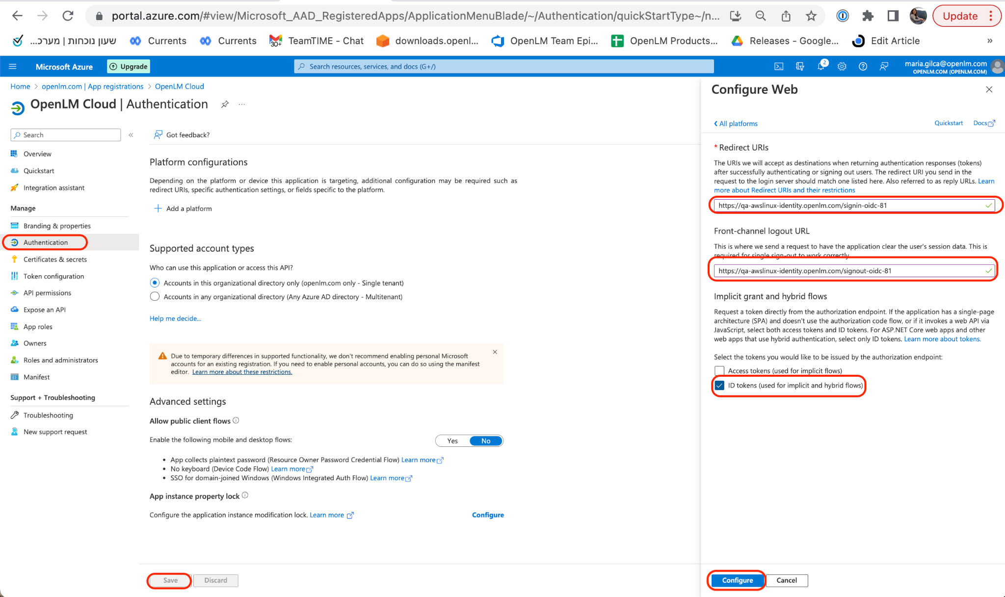 - Return to your Azure Active Directory account. Navigate to the Authentication section. Click Add Platform. Choose "Web" then provide the information for the Redirect URLs: Front-channel Logout URL and Web Redirect URL. Check the ID Tokens and choose who can use this application. Click Configure then Save.Note: The Redirect URLs are required to be taken from OpenLM Cloud Portal (as shown in the image, in step 7 above) when adding a new external provider.