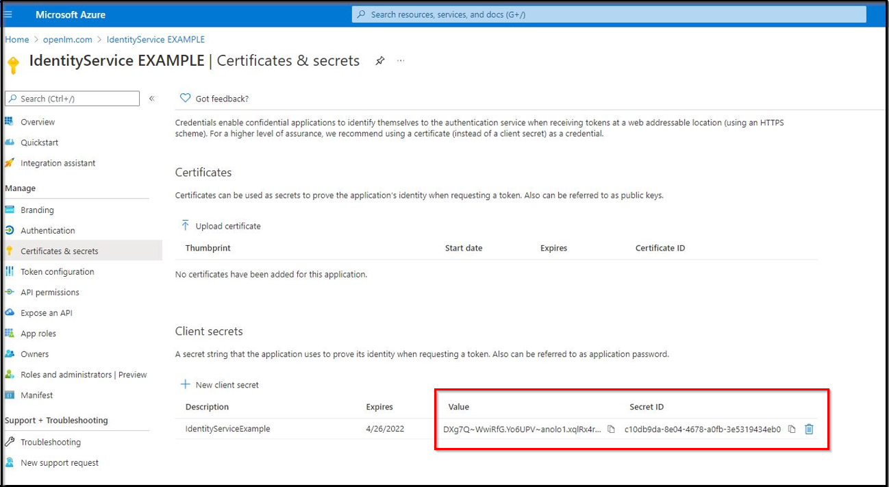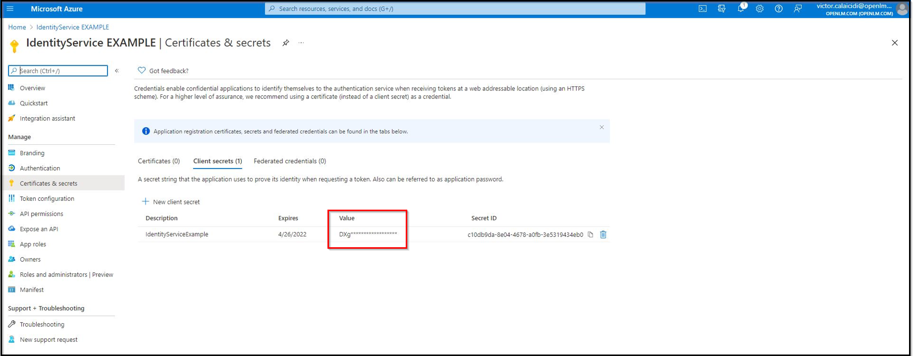 Important! Client secret values cannot be viewed, except immediately after creation. Be sure to save the secret ID when created before leaving the page.
