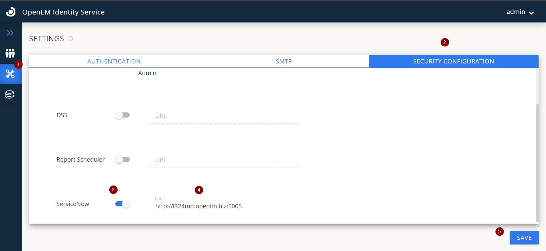 First, the External Platforms Service must be connected to the Identity Service in order for the ServiceNow integration to work. To do so, login to the Identity Service, go to the Settings tab→Security Configuration→ toggle on the ServiceNow button and provide its URL. Click Save. Restart the ServiceNow Service.