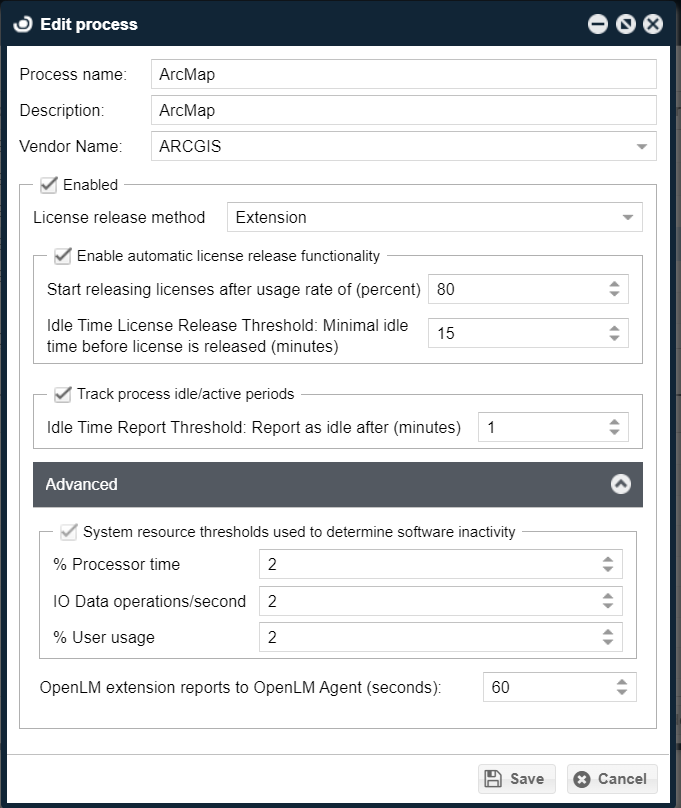 1. The ‘Advanced' panel can be expanded to set the system resource threshold parameters. These numbers are thresholds used for determining whether the monitored application is idle. The default values shown should not be changed unless explicitly instructed by OpenLM Support. Wrong values can adversely affect the OpenLM system's performance.