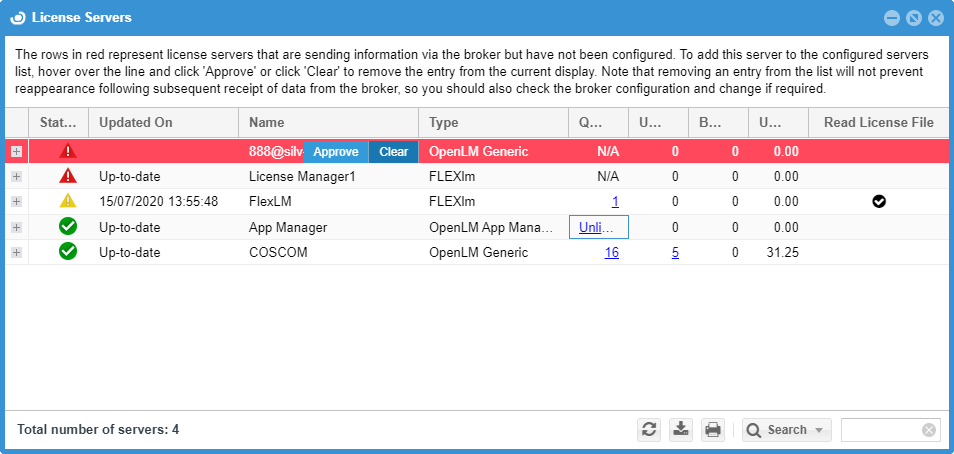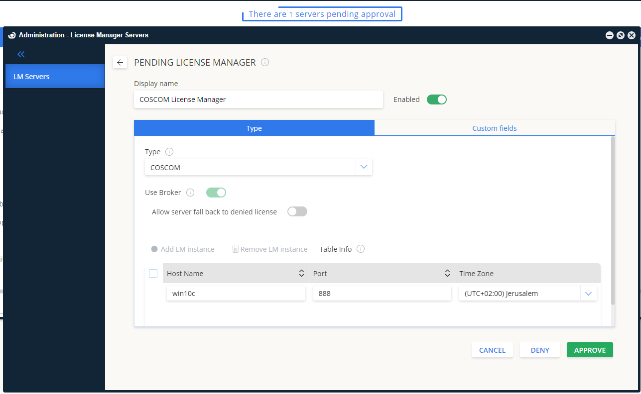 - In the License Servers window, click on the pending approval link, double-click on the Pending license manager that contains the details of the newly added COSCOM LicenseMonitor LM server entry and click Approve.