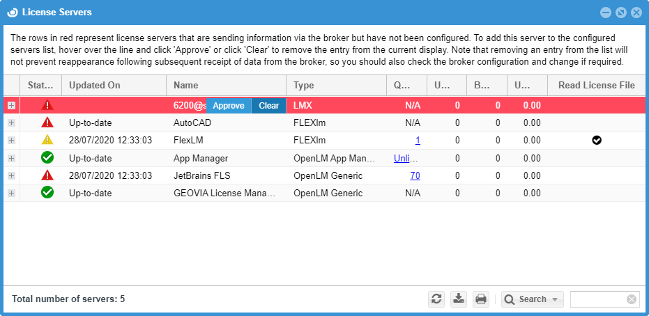 - In the License Manager Servers window, at the top center license servers are listed which are pending approval.