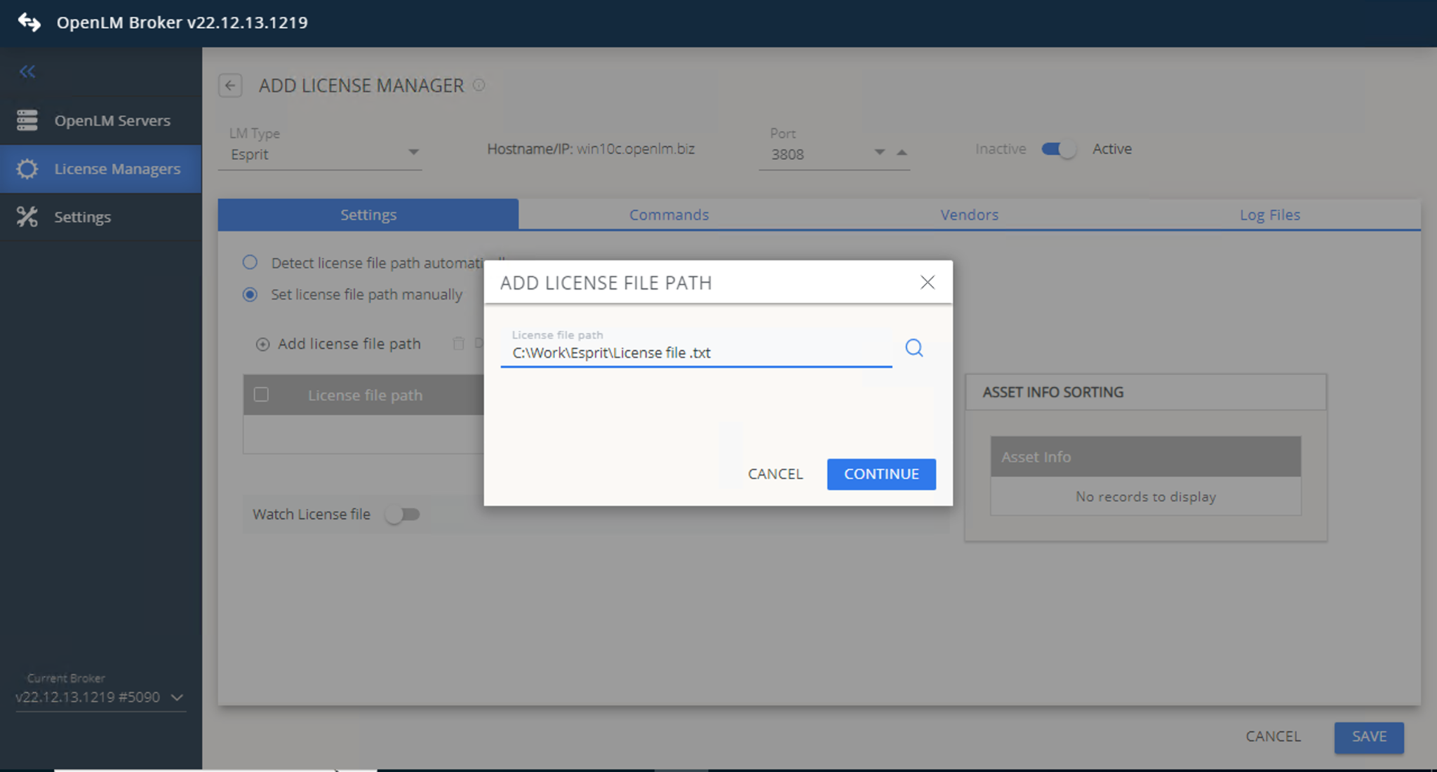 b. Set license file path manually. Click Continue, as in the example depicted below. - Warning! Make sure the Watch License File toggle is left unchecked.