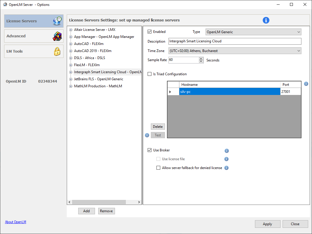 The Intergraph Smart Licensing Cloud configuration has now been automatically added to OpenLM Server and should also be present in the OpenLM Server configuration tool.