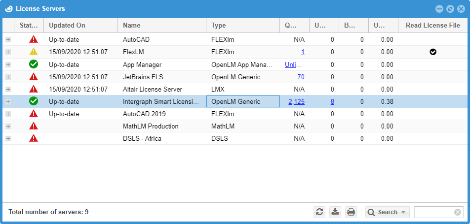 The License Servers window will open. Verify that the configured license manager(s) appears on the list. A green circle node indicates an active connection to the license server.