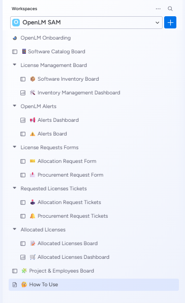 Once App is Installed, the OpenLM SAM application provides a workspace that includes forms, boards, and automation workflows to support software asset management activities.