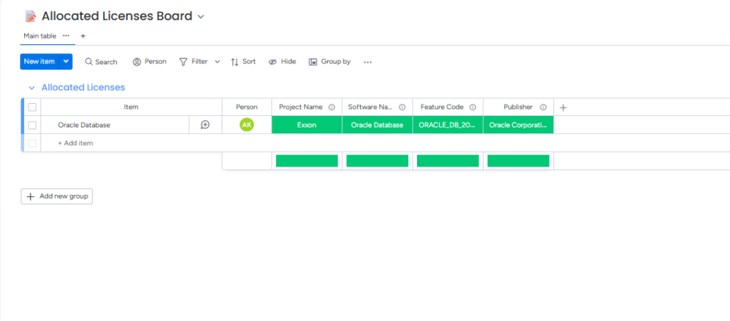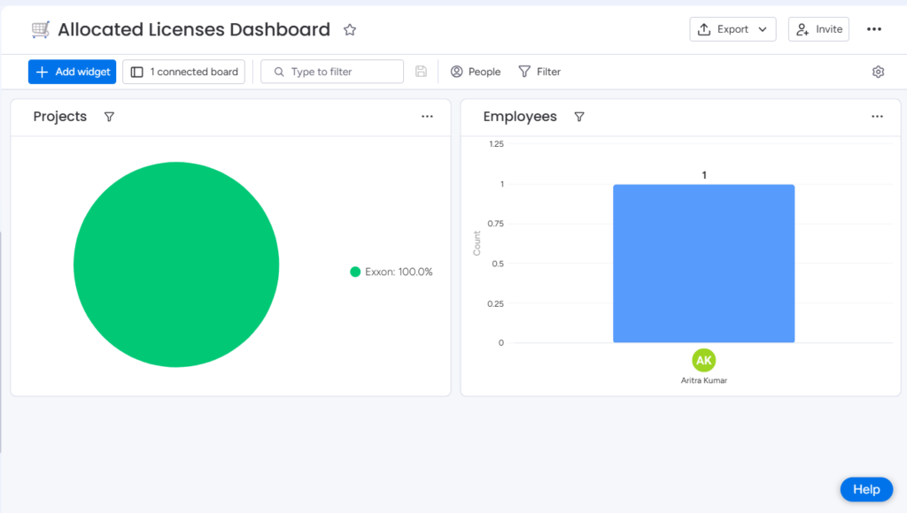 - Project & Employee Mapping: Use the built-in Projects & Employees Board to maintain your organization’s specific data for ongoing, completed, or halted projects with employees. While this board is maintained manually by the customer, it unlocks powerful insights by automatically tracking license usage and allocation on an employee-by-employee and project-by-project basis.