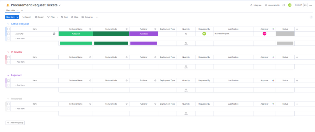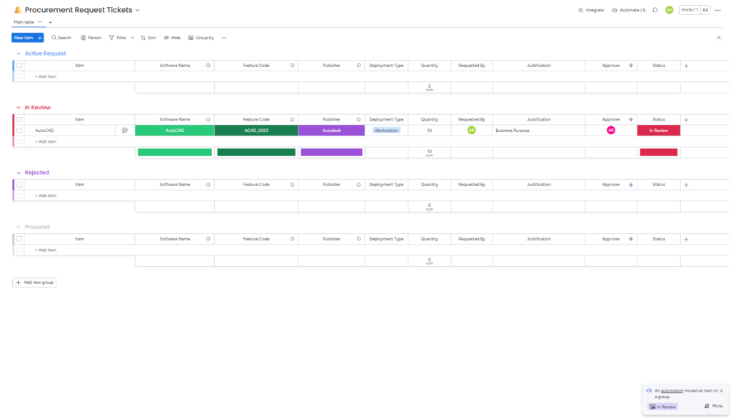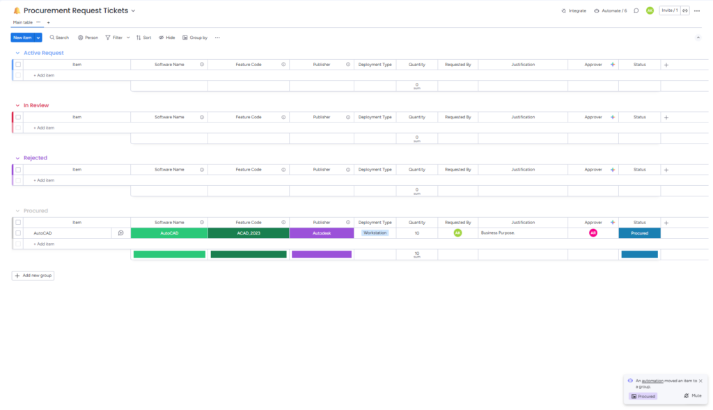 - Initiate Procurement: When new licenses are needed, IT Admins use the Procurement Request Form. A ticket is instantly created in the Procurement Request Ticket Board, notifying the CAD/CAM Manager via email. (Note: Companies must manually configure CAD/CAM Manager profiles within this board).