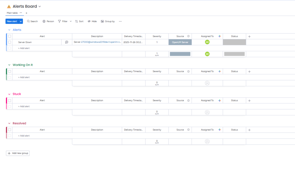 - Manage Real-Time Alerts: All OpenLM system alerts are pushed to the Alerts Board, automatically tagging and emailing the default assignee. From there, alerts can be re-assigned and managed by the concerned one through organized statuses: “Working on it,” “Stuck,” or “Resolved.”