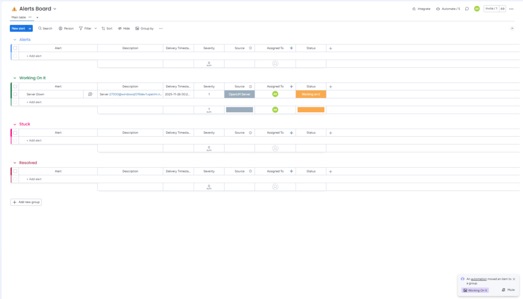 Alerts Board – Example Alert: The above images show a alert being moved from default state to Working on it group after it is marked as Working on it