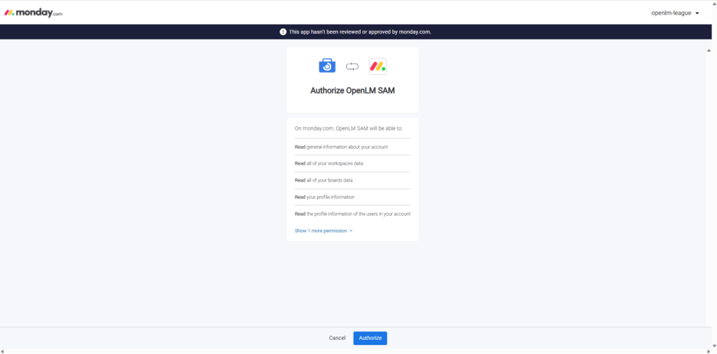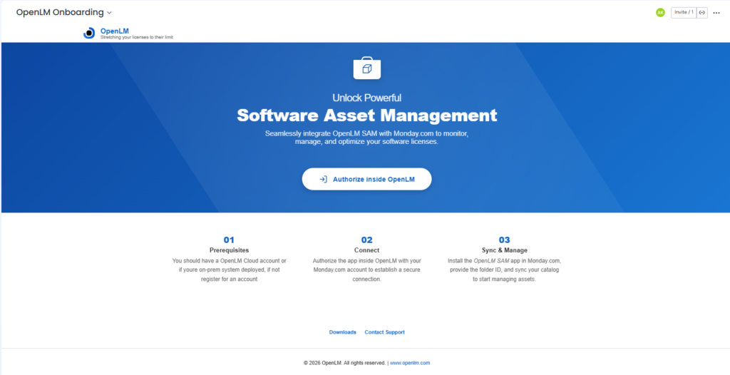 - Authorize the Connection: Start at the OpenLM Onboarding page, where you are redirected to the OpenLM UI to authorize the integration, allowing SAM data to flow securely into your monday.com instance inside OpenLM SAM app.