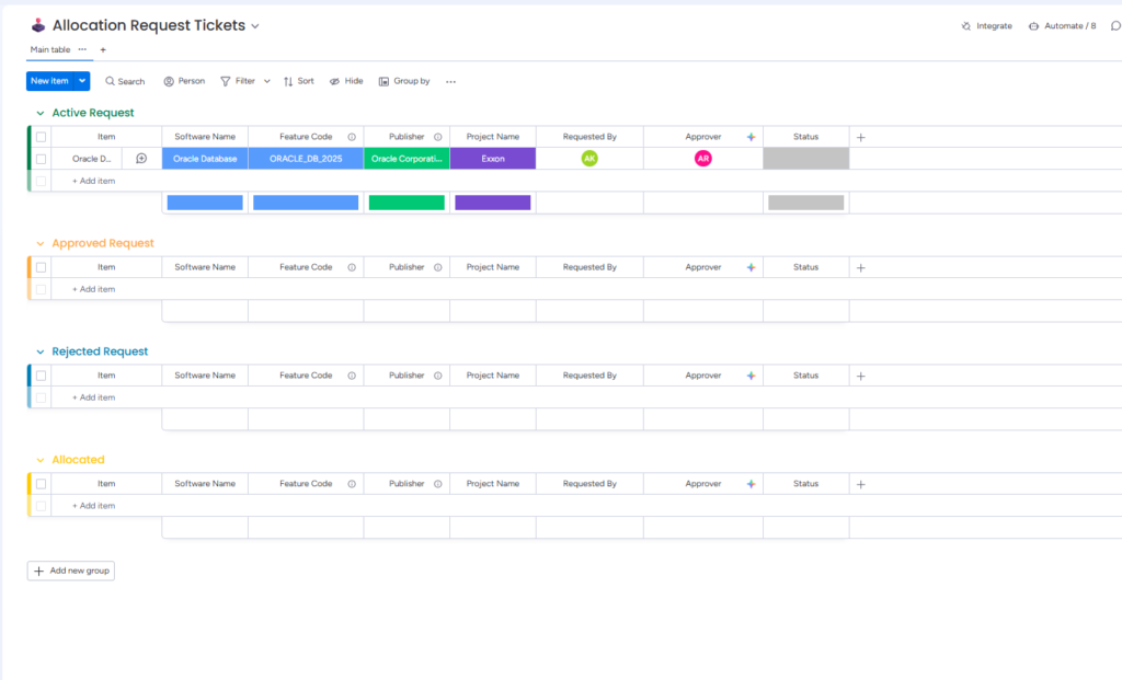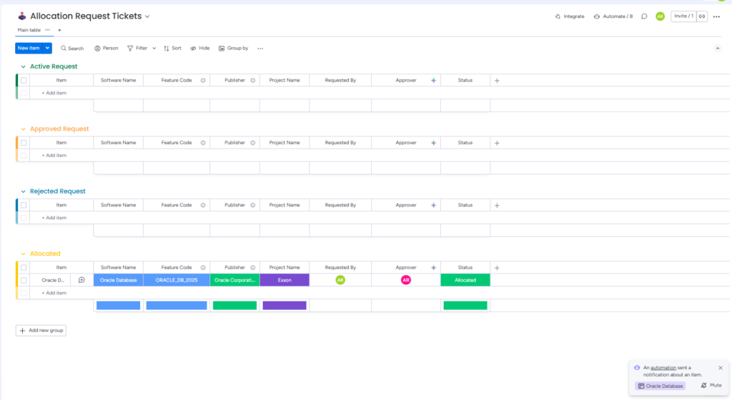 License Allocation Request Board(Tickets): This board displays all license allocation requests. Administrators can take actions such as approve or reject requests, which will trigger the corresponding automations.