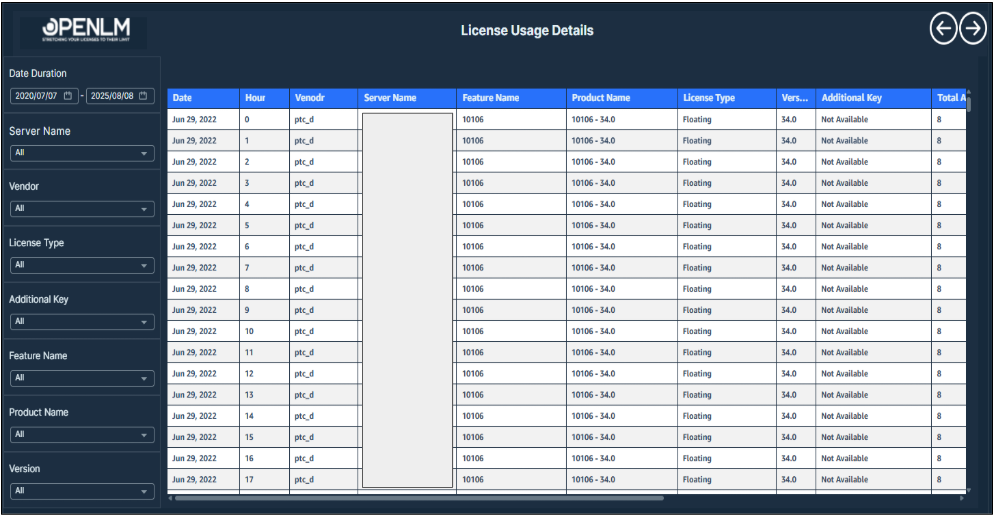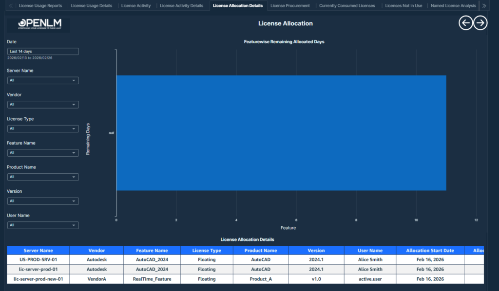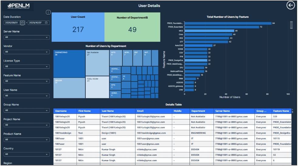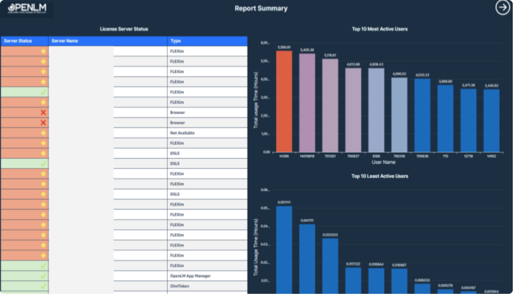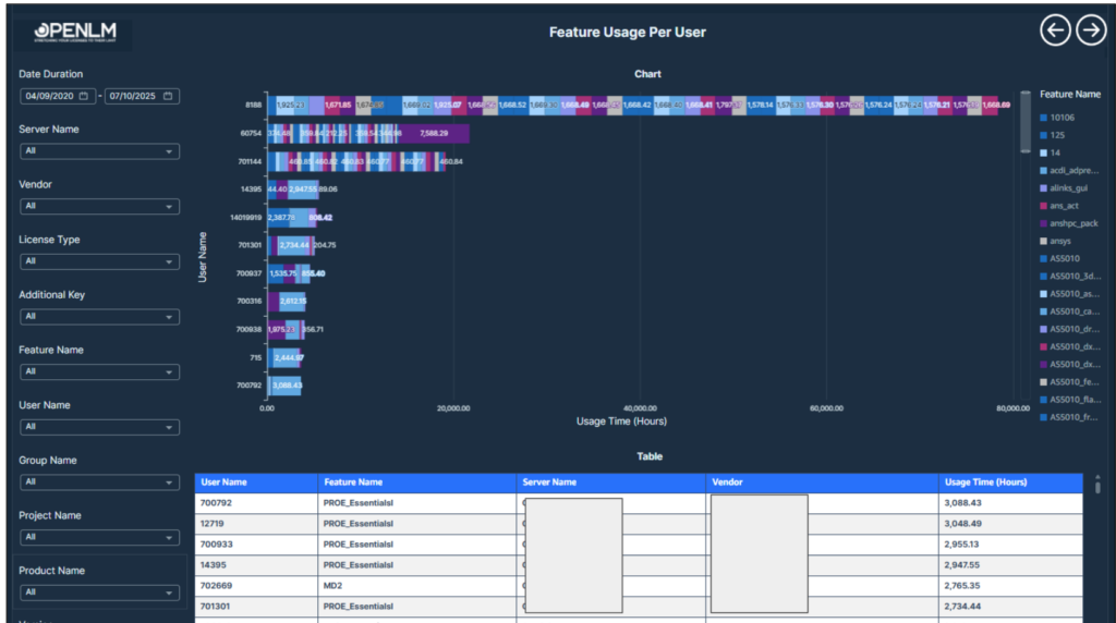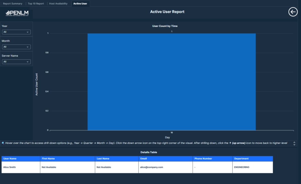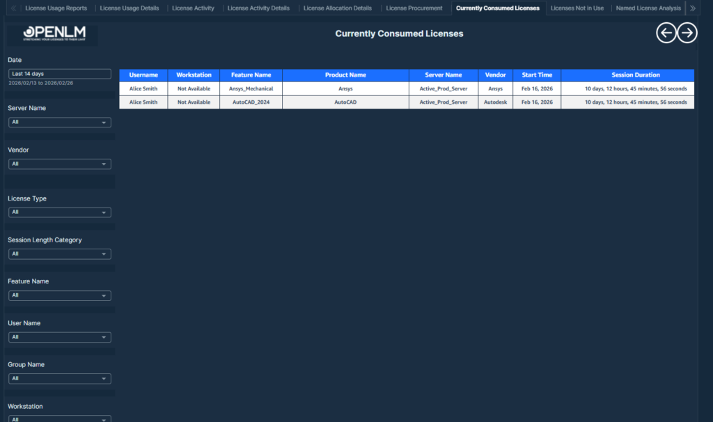 This table displays the current license consumption details, including user activity, license attributes, and usage duration. Further, Top 10 Active Sessions by Duration (Minutes) are mapped to users for high-usage insight.