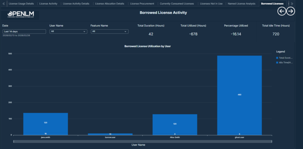 The Borrowed License Activity Report provides an overview of how borrowed software licenses are being used within the organization.