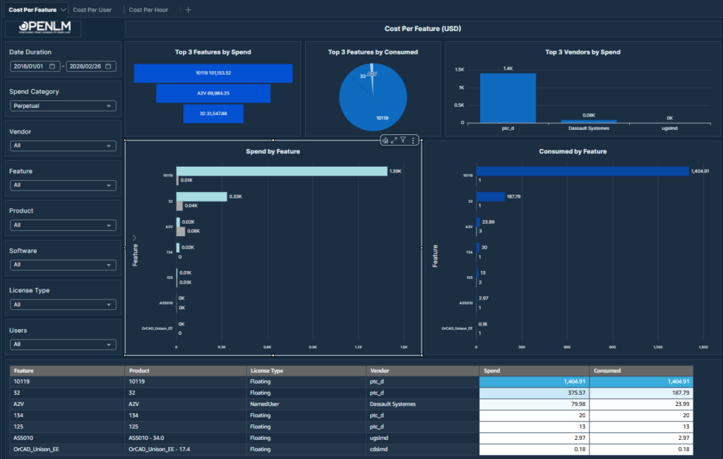 Analyze spending by software feature. Provides a comprehensive view of licensing costs and consumption per feature.