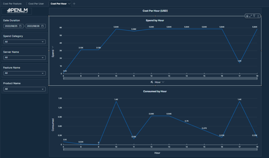 Identify cost distribution across the day. Shows an hourly breakdown of software licensing Spend and Consumed across the selected date range.