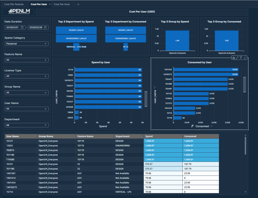 Analyze spending by user and department. Breaks down licensing costs and consumption at the user level, highlighting top departments and groups by spend and consumption.