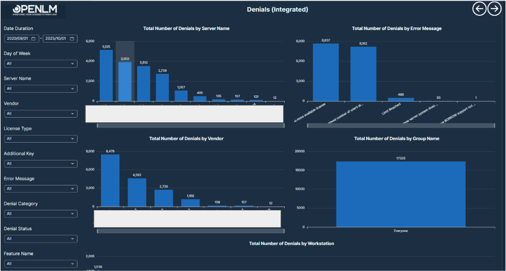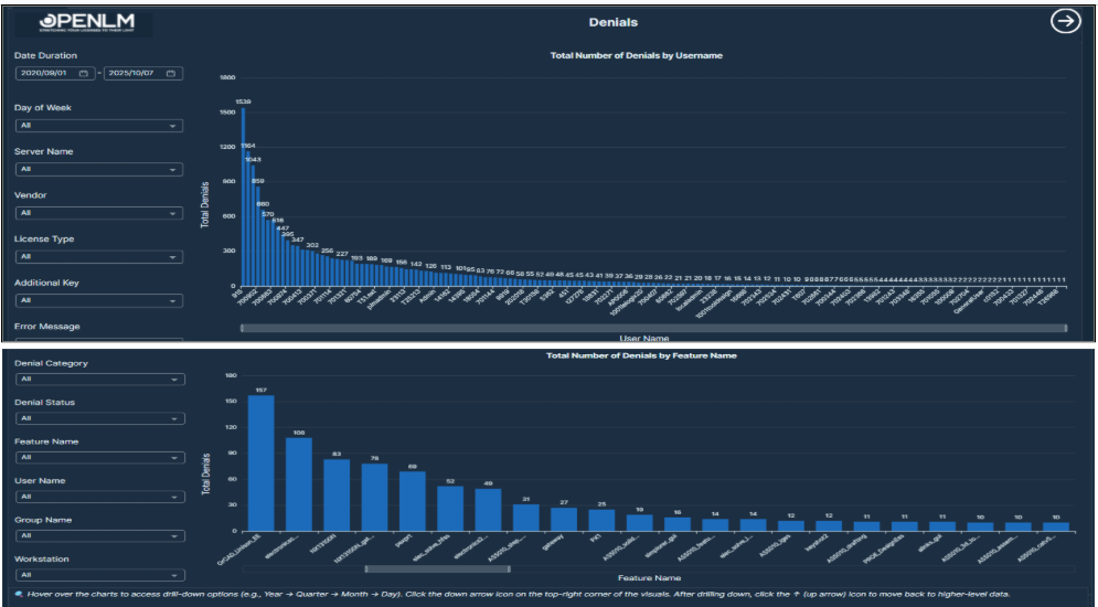 This report shows where users couldn’t get a license because none were available. It helps pinpoint licensing shortfalls and peak demand challenges.