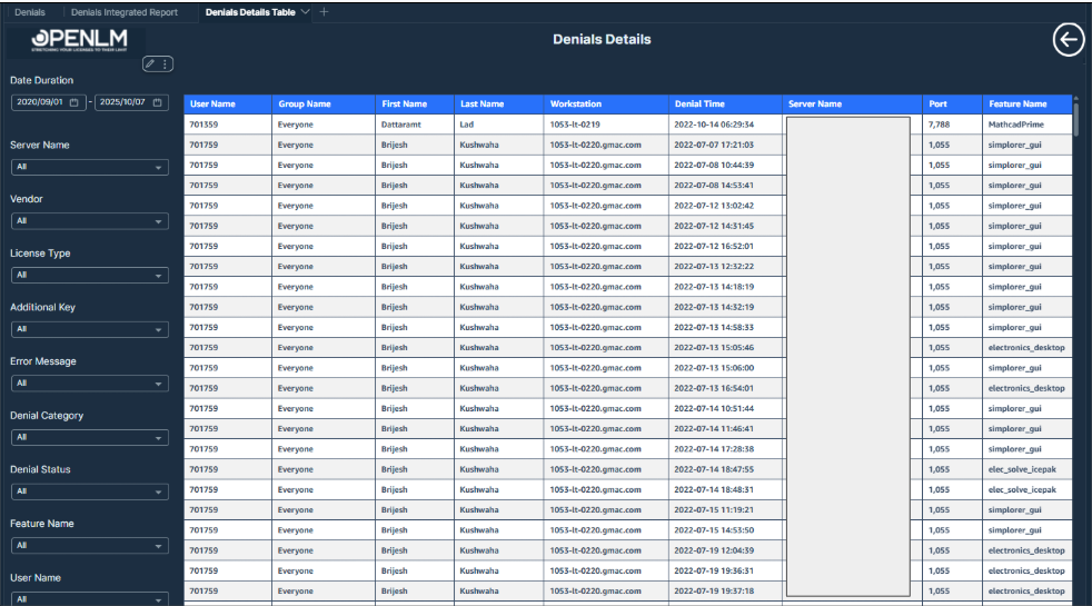 Detailed Table View of License Denials (Accessed via Drill-through)