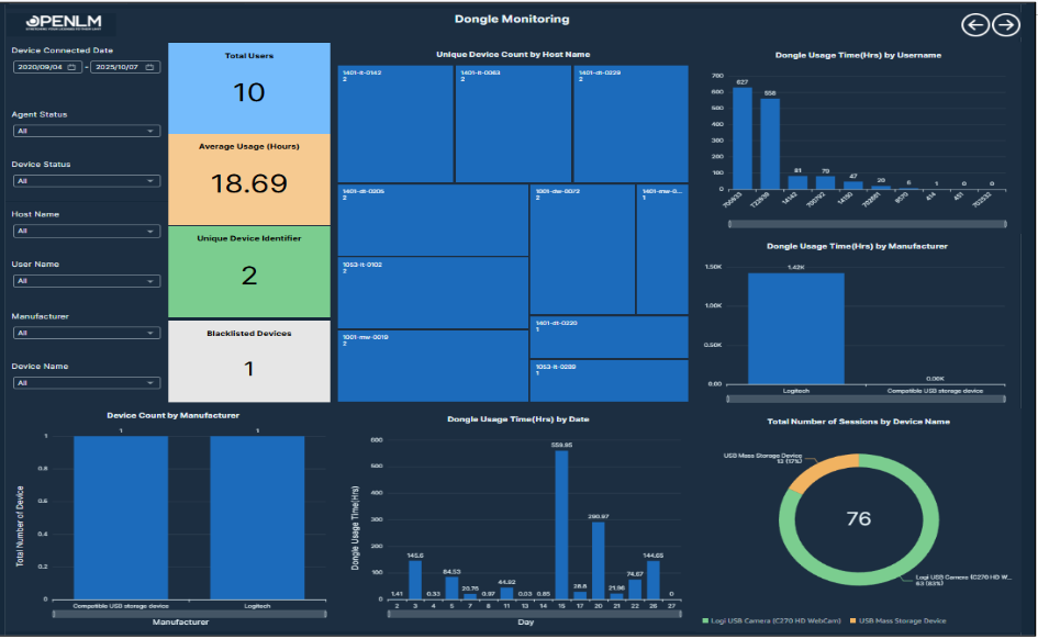 This report monitors dongle device usage, identifying user behavior, hardware distribution, and security compliance through real-time and historical tracking.