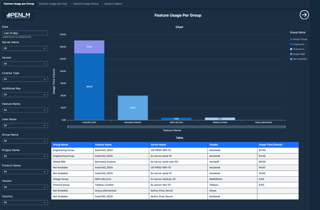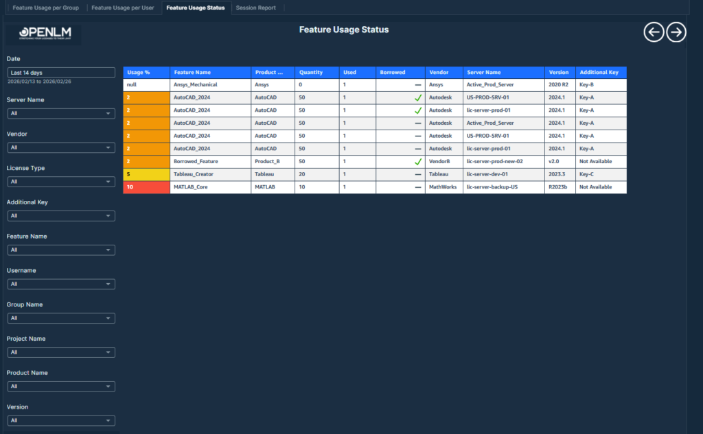 Feature Usage Status – Displays current license usage percentages, borrowed counts, and feature-level licensing details.