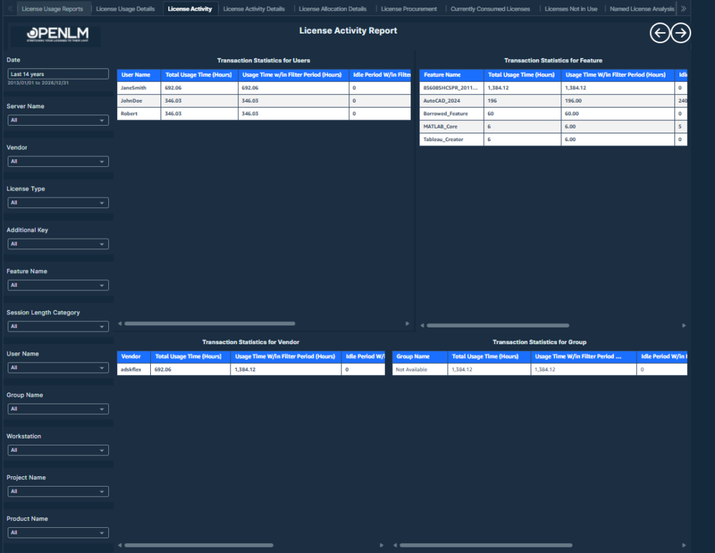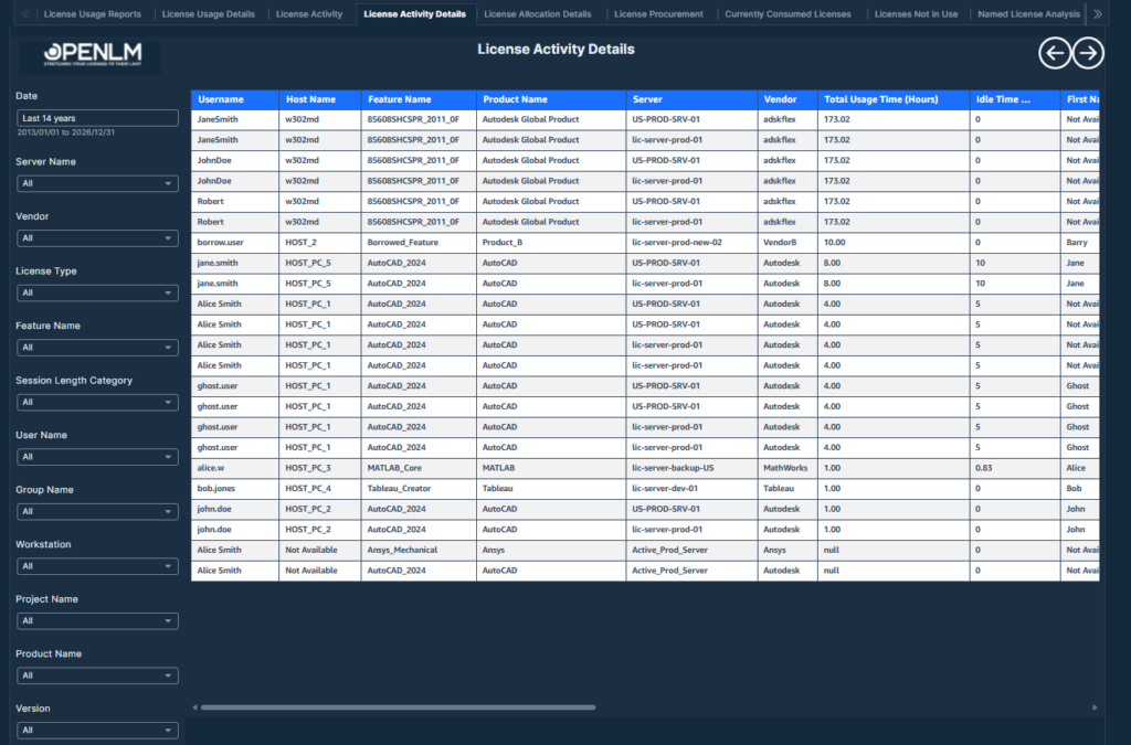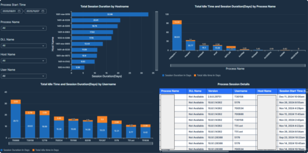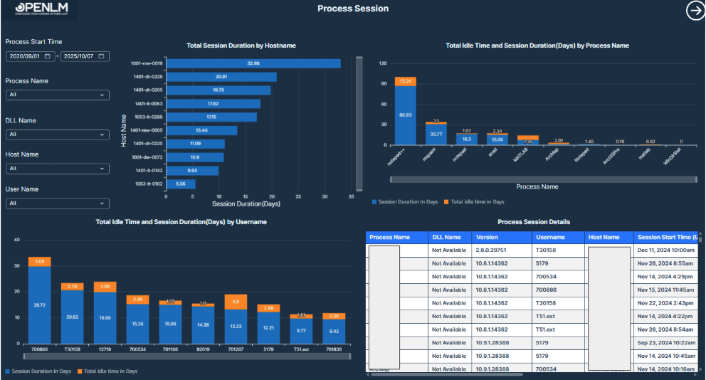 This report visualizes process-level license session durations, idle times, and user-machine activity for detailed process usage monitoring.