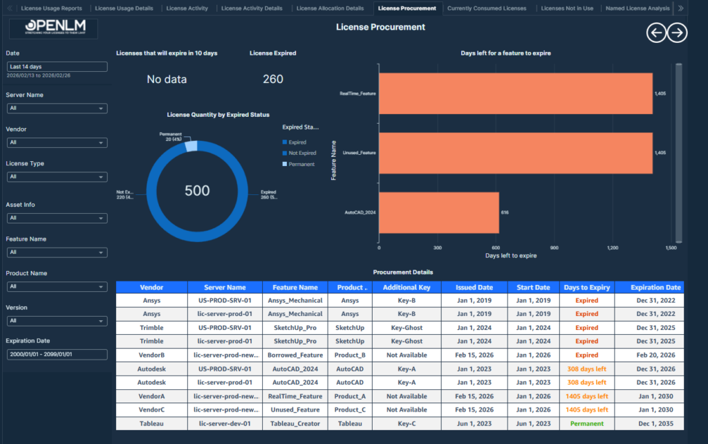 This report includes several visualizations depicting various aspects of license usage.