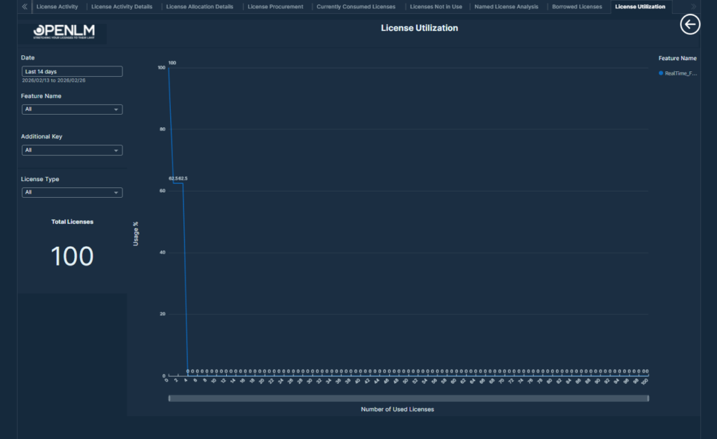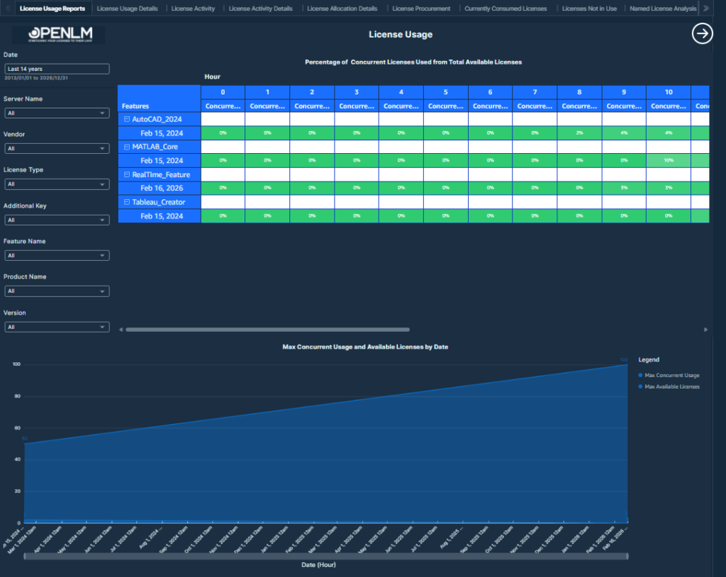 This table displays the feature-wise maximum concurrent license usage and as a percentage of total available licenses, with drill-down capability to assess license utilization efficiency.