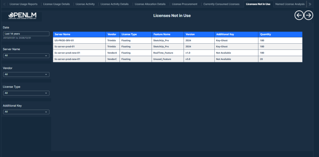 Table displaying unused licenses with transaction count zero, showing server, vendor, feature details, version, additional key, and available quantity.