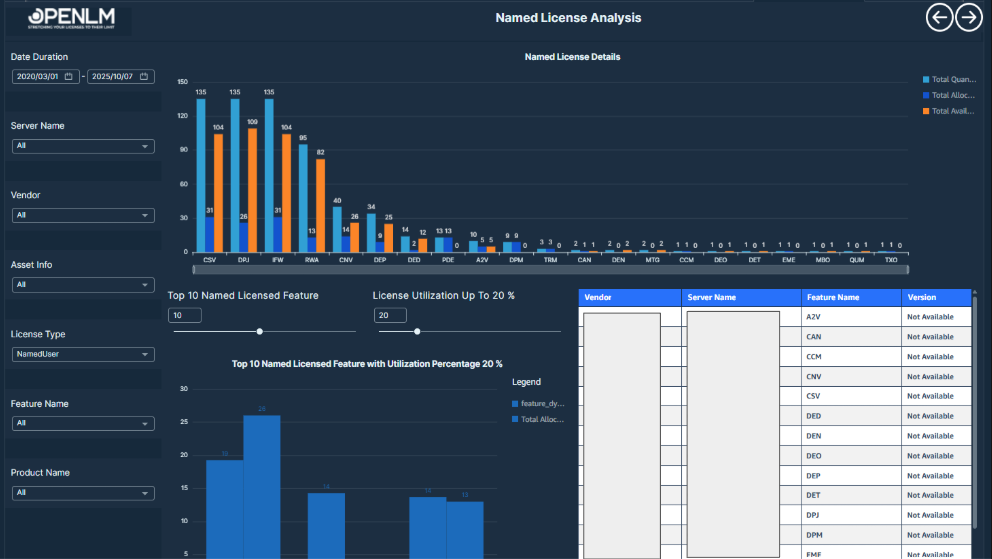 Table displaying Named License Analysis with user-specific allocation details, including license type, feature, server, vendor, start and end dates, and usage metrics.