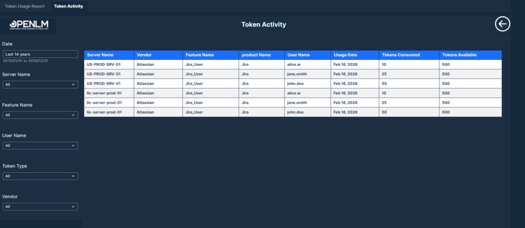 A detailed log view that tracks each token consumption event by user, feature, and date for transparent licensing audits.