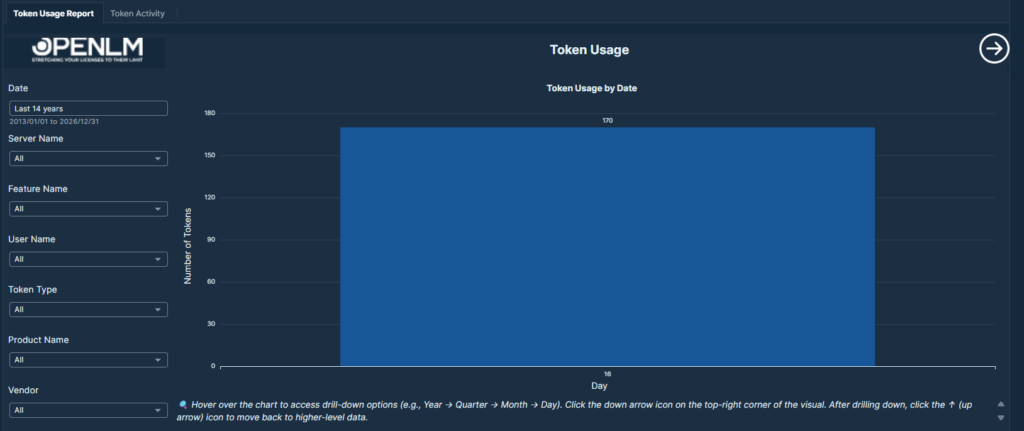 A detailed report visualizing token consumption trends across dates, users, and features for efficient license resource management.