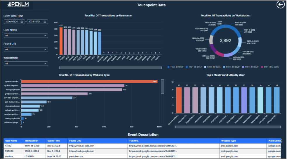A comprehensive report visualizing user web interactions, workstation activity, and frequently accessed URLs for browser-based monitoring.